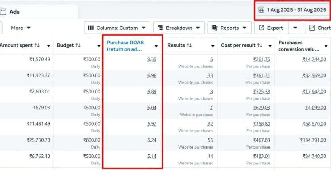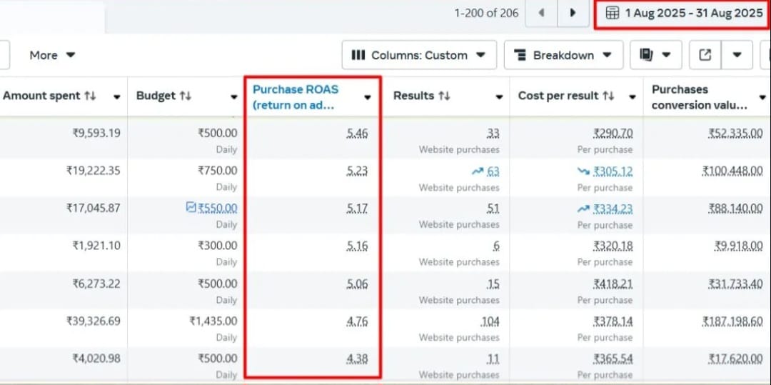 In 31 days (1 Aug 2025 – 31 Aug 2025), the campaigns generated 283 purchases and ₹4.87L in purchase value on ₹97.4K ad spend, with ROAS ranging from 4.38x to 5.46x (avg ~5.0x).